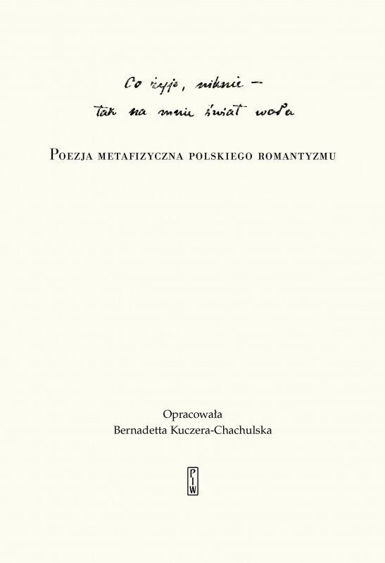 „Co żyje - niknie, tak na mnie świat woła" Bernadetty Kuczery-Chachulskiej to autorski wybór wierszy czterech najważniejszych poetów polskiego romantyzmu: Adama Mickiewicza, Juliusza Słowackiego, Zygmunta Krasińskiego i Cypriana Norwida. Tom został uzupełniony o oryginalne studium interpretacyjne. Według badaczki metafizyczna myśl w sztuce słowa polskiego romantyzmu stała się możliwa dzięki formalnej rewolucji języka poetyckiego, która dokonała się w XIX wieku. Dynamika zmian społecznych oraz rozwój nowych sposobów artystycznego wyrażania nałożyły się na siebie, tworząc szczególny splot. Książka Kuczery-Chachulskiej stanowi wyjątkową próbę odczytania metafizycznego wymiaru poezji romantycznej.
