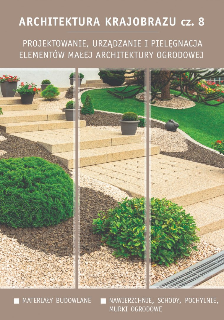 Architektura krajobrazu to, oprócz ukształtowania powierzchni oraz nasadzeń roślinnych, także komunikacja i małe elementy uzupełniające. Wyposażenie danego obiektu w tego rodzaju elementy zależy od jego funkcji i przeznaczenia. W procesie projektowania niezbędna jest również znajomość materiałów budowlanych, podstawowych zasad budowy oraz konstrukcji elementów małej architektury. Wykonanie projektu musi zapewnić funkcjonalność, trwałość i bezpieczeństwo dla przyszłych użytkowników. Część 8. podręcznika przedstawia zasady kompozycji i techniki wykonania takich elementów jak: nawierzchnie (drogi i place), pochylnie, schody i murki ogrodowe.