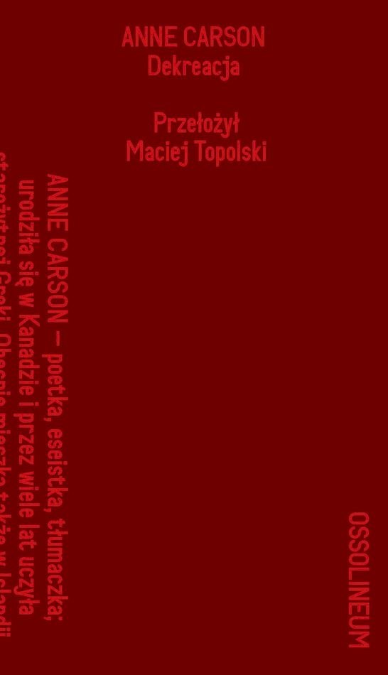 W Dekreacji Anne Carson podejmuje próbę przekroczenia własnego „ja", by oddać głos temu, co niewyrażalne i radykalnie odmienne. Przy pomocy naświetlających się wzajemnie utworów, w kolażu literackich form i stylów - od wierszy, przez krytyczno-filozoficzne eseje i dialogi, po operę poetycką - kieruje wzrok ku postaciom, które, mówiąc słowami Simone Weil, „uczestniczyły w kreacji świata przez dekreację samych siebie". Pisze m.in. o Samuelu Becketcie, Marguerite Porete, Safonie czy filmach Michelangelo Antonioniego.