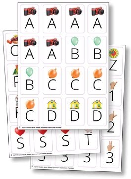 Zestaw kartoników z literami i obrazkami, których nazwy rozpoczynają się daną głoską, a także z liczbami przedstawionymi za pomocą palców dłoni i cyfr.