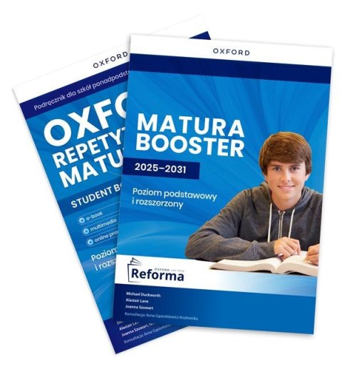 Oxford Repetytorium Maturzysty to elastyczny i nowoczesny kurs dla uczniów szkół ponadpodstawowych, który kompleksowo przygotowuje do egzaminu maturalnego w nowej formule.Nowość! Od roku szkolnego 2024/25 repetytorium zawiera dodatkowy komponent - Matura Booster 2025-2031, w którym znajduje się bogaty pakiet zadań przygotowujących do nowej matury, w tym zadania na rozumienie ze słuchu, znajomość środków językowych oraz tworzenie wypowiedzi pisemnych, a także nagrania audio, modelowe prace pisemne oraz przykładowy ustny i pisemny egzamin.Zalety kursuPomaga osiągnąć sukces na maturzeZawiera wszystkie rodzaje zadań obowiązujące na egzaminie od 2023 rokuOxford 3000 i Oxford 5000 - lista starannie wyselekcjonowanych, najczęściej używanych i najbardziej przydatnych słów, opracowana przez oksfordzkich leksykografówRozbudowane sekcje rozwijające znajomość środków językowychWordpower - dodatkowe zadania leksykalne utrwalające m.in. idiomy, kolokacje i wyrażenia czasownikoweBrainpower - leksykalne powtórki kumulatywne i strategie efektywnego zapamiętywaniaUmożliwia stosowanie nowoczesnych rozwiązańPodręcznik z interaktywnym e-bookiemDodatkowe zadania Online Practice i wideo ze wskazówkami egzaminacyjnymiPomoce dla nauczyciela: Classroom Presentation Tool oraz zasoby cyfrowe Teacher ResourcesOnline Practicedzięki nagraniom oraz interaktywnym zadaniom umożliwia uczniom doskonalenie sprawności językowych w angażującej formie pomaga doskonalić poprawną wymowę dzięki zadaniom z opcją „wysłuchaj, nagraj i odtwórz"pozwala na nieustanne śledzenie postępów uczniów i ocenienie dzięki automatycznym raportomumożliwia wykorzystanie komputera lub urządzeń mobilnych do łatwej i przyjemnej powtórki materiałuMatura Booster· dodatkowe zadania na rozumienie ze słuchu i znajomość środków językowych w formacie egzaminacyjnym na poziomach podstawowym i rozszerzonym· przykłady modelowych prac pisemnych i dodatkowe zadania na tworzenie wypowiedzi pisemnej w formatach egzaminacyjnych· kompletny ustny i pisemny egzamin maturalny na poziomie podstawowym