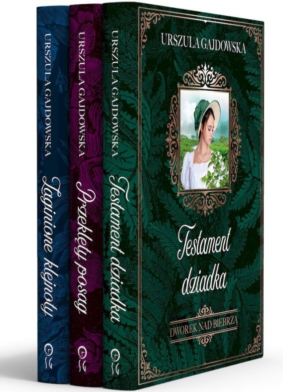 Pakiet trzech tomów cyklu obyczajowo-historycznego Urszuli Gajdowskiej Dworek nad Biebrzą zawiera: Zaginione klejnoty, Przeklęty posag i Testament dziadka. W pierwszym tomie w tajemniczych okolicznościach ginie cenny rodowy klejnot pewnego szlachcica, w drugim dręczona koszmarami Henrietta musi rozwiązać tajemnicę skradzionego posagu, aby zdjąć fatum ciążące na jej rodzinie. Tom trzeci to sekretne śledztwo prowadzone przez hrabiego Modlińskiego i tajemnica młodego barona. Flirty, romanse i namiętności w XIX-wiecznym sztafażu. Wyzwolone kobiety, niebezpieczne przygody, sekretne śledztwa i alchemiczne eksperymenty oraz szokujące XIX-wieczne kuracje medyczne i klątwa Wielkiego Niebieskiego Diamentu.
