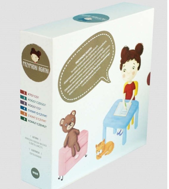PRZYPADKI AGATKI to sześć książeczek dla maluchów, które dopiero uczą się mówić oraz dla dzieci z zaburzeniami komunikacji językowej. Odmiana rzeczowników została pokazana w sposób najprostszy, okraszona pięknymi rysunkami Edyty Karaban, dzięki czemu dzieci z chęcią odkrywają zasady fleksji języka polskiego i uczą się poprawnej mowy.